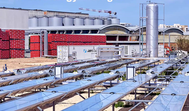 A 460 kW parabolic trough collector field from Absolicon has been installed at the Birra Peroni brewery in southern Italy. The system produces pressurized water, which is either converted into steam via a steam compressor and fed into the brewery’s 156?°C steam network, or used directly at 82?°C for the bottle-washing station. A 2 MWh pressurized hot water storage tank enables solar steam supply even during nighttime operations. Photo: Absolicon