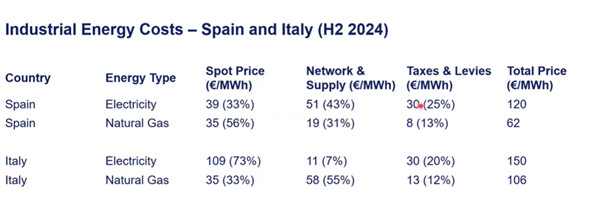 We’ve analyzed industrial energy costs in countries like Spain and Italy (see table below). Even when the spot price is zero, additional costs for electricity supply can still reach 79 EUR/MWh in Spain and 41 EUR/MWh in Italy. That said, verifying these figures is difficult, as companies rarely disclose their full energy bills.